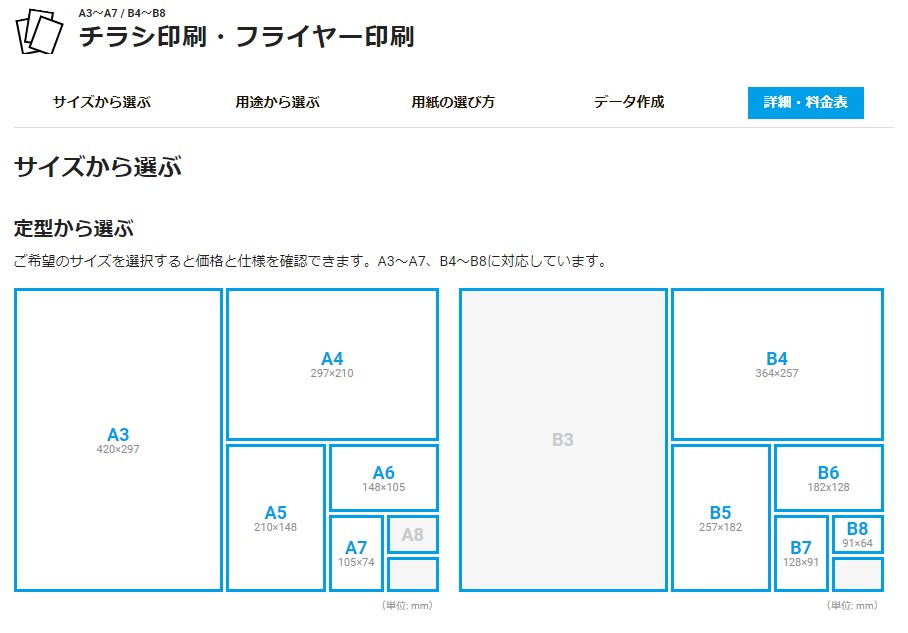 ラクスルのチラシ印刷ページ 様々なサイズや用紙の選択が可能:ラクスルサービスサイトより引用