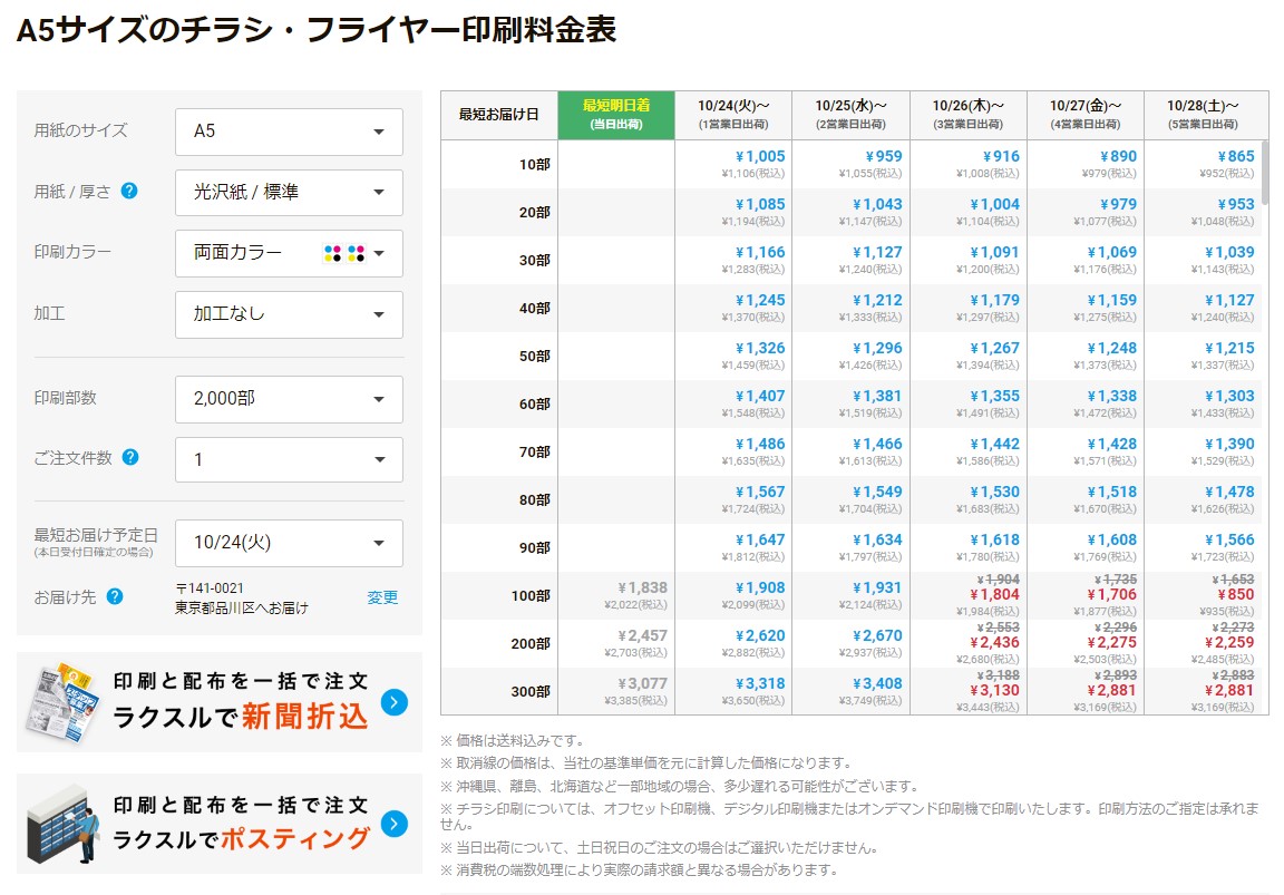 折込やポスティング以外では少ない部数の印刷にも対応している ラクスルサービスサイトより引用