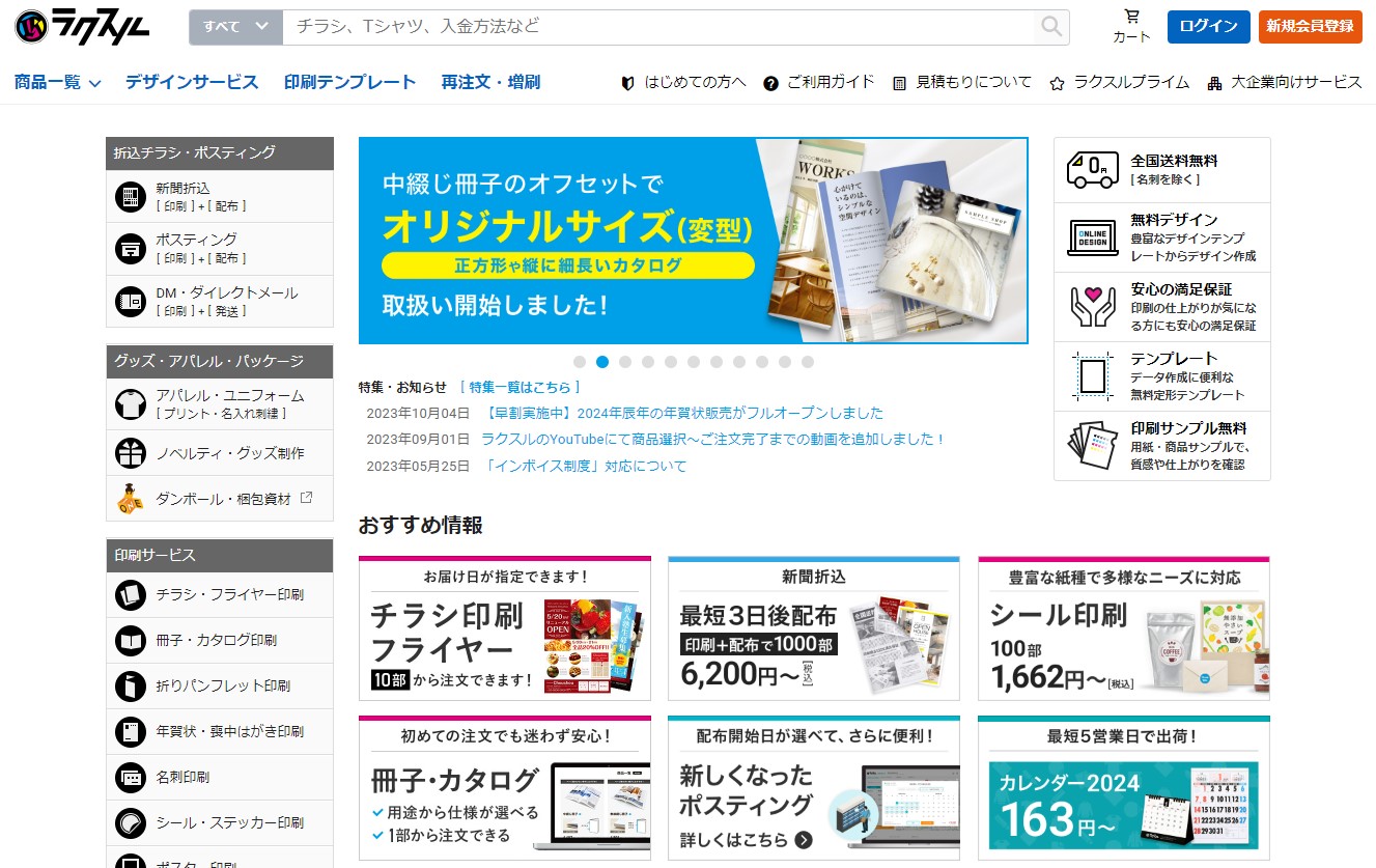 ラクスルのサービスサイトではメインの印刷サービスが豊富に用意されています。