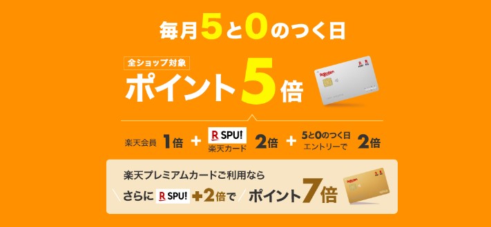 毎月の5・10・15・20・25・30日の定期キャンペーンです。楽天カード(プレミアムも含む)を利用した上でこちらの専用ページでエントリーすると、合計5倍のポイントがもらえます。