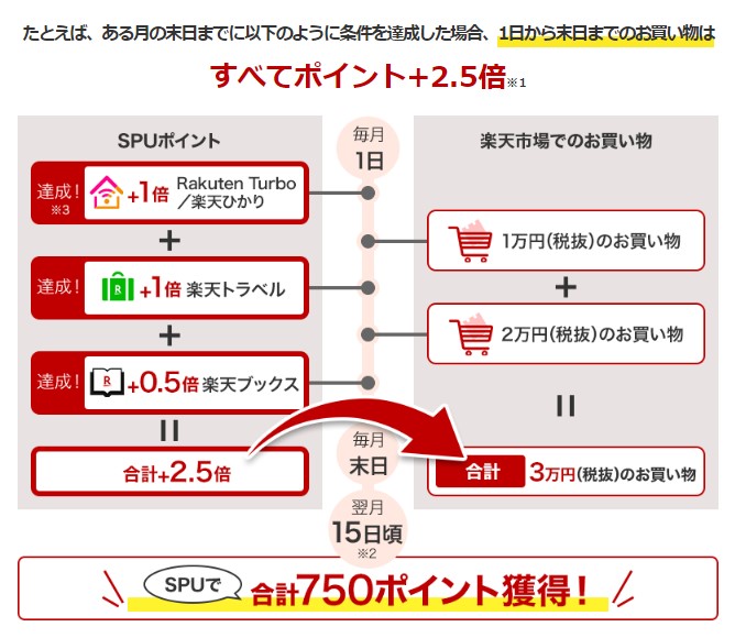 楽天グループのサービス複数使用し、それぞれの条件を満たすことでポイント還元率が自動的にアップします。SPUの詳細はこちらで確認